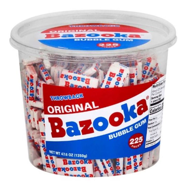 Bazooka brand’s iconic bubble gum is available in a handy 225-piece tub! The signature taste of Bazooka Bubble Gum you know and love, with a throwback to the brand’s classic look plus original comics! The Bazooka tub comes with 225 pieces of original flavour Bazooka Bubble Gum. Unwrap each piece to enjoy the original Bazooka Joe comics. Bazooka also lets you take the fun online, with unique codes under each wrapper that let you unlock fun videos, games, and other exclusive content. Tub is easy for pantry, concessions, and much more. Try the delicious gum that fans worldwide have loved for generations!