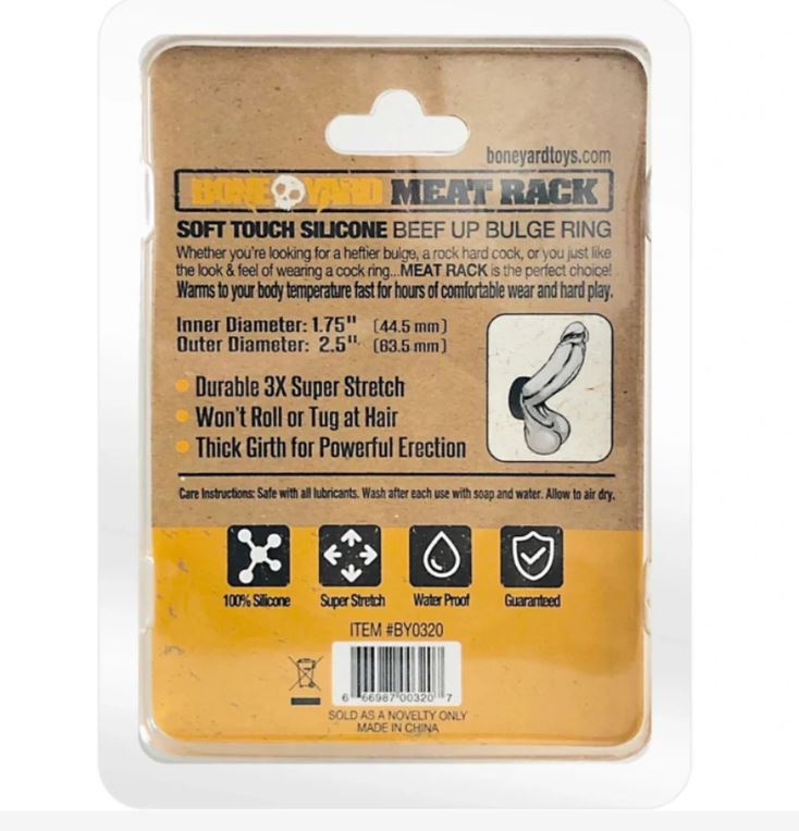 The Meat Rack – This beefy cock ring is made of 100% super stretchy silicone. The Meat Rack is made for comfort and durability with a soft feel and non-roll design. Its’ thick girth ensures a more powerful erection. The 3X stretch allows for 1 size to be used over cock, balls or both.
