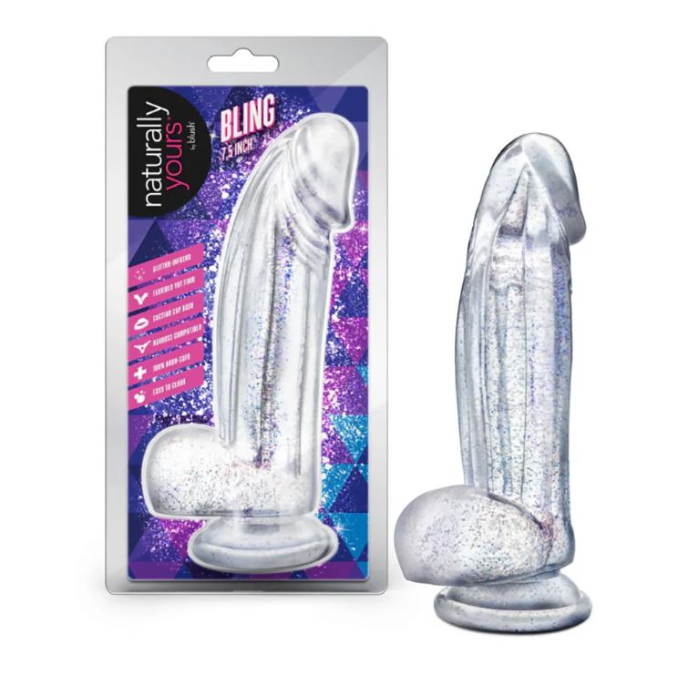 Glitter-Infused For Vibrant Color & Sparkle Flexible Yet Firm For Maximum Pleasure Suction Cup Base & Harness Compatible 100% Body-Safe, Travel-Friendly, Easy To Clean 7.5 Inch Length (5.5 Inch Insertable) x 2 Inch Width Compatible With Tester Display(s): Product Description Step into the spotlight with Bling, the glittering star of your pleasure collection. With its radiant color and subtle sparkle, Bling adds a touch of glam to every intimate moment. Perfect for those who like their toys with a little extra flair. At 7.5 inches, it’s a versatile size that’s ideal for both solo exploration and partnered play. Designed to be flexible yet satisfyingly firm, Bling adapts to your movements while offering a fulfilling experience. The strong suction cup base secures easily to smooth surfaces for hands-free fun and is fully harness compatible, giving you endless options for playful discovery. With its 100% body-safe design, Bling is easy to clean and always ready for an encore. Whether you’re indulging in a solo performance or sharing the stage with a partner, Bling ensures every scene ends with a standing ovation.