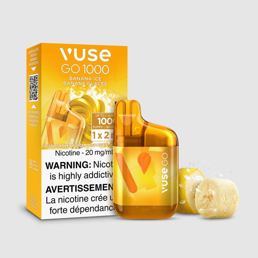 A Vuse GO Banana Ice disposable device, featuring a creamy banana flavour with an icy cool freshness.